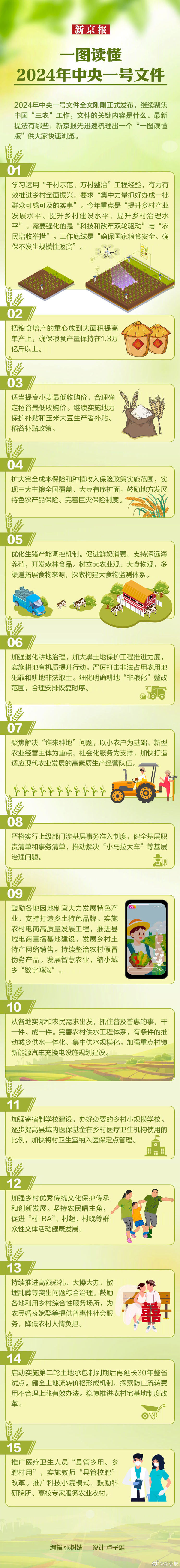 2024年中央一号文件全文刚刚正式发布,继续聚焦中国“三农”工作,文件的关键内容是什么、最新提法有哪些,新京报先迅速梳理出一个“一图读懂版”供大家快速浏览↓↓↓